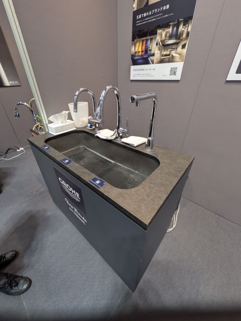 グローエ。ドイツで誕生した世界最大級のシェアを持つ水まわり製品のリーディングカンパニー。今はリクシル傘下ですが、デザインは日本にはないユーロ感覚。ペニンシュラキッチンやオープンタイプのキッチンには最高に似合う水栓です。ただ、使いやすさだけを考えると日本のメーカーの方がいいような。(個人的な意見ですが・・・)シャワー時の水の出方やストレートとシャワーの切り替え時の操作感など少し独特な感じ。でもそこがユーロ感覚でいいところ。こちらの展示台は実際に吐水口から水も出るので「なるほど!」と実感できました。弊社でもこんな展示台をつくってみたいものです。