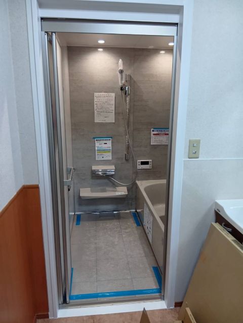 脱衣場との出入口は、最小限に施工部分を小さくおさめています。今回は、元々の開口部分と新しいシステムバス開口部分がそこまで違いがなかったのでうまく施工できました。*現場によっては左右15cmほど補修する場合もあります。